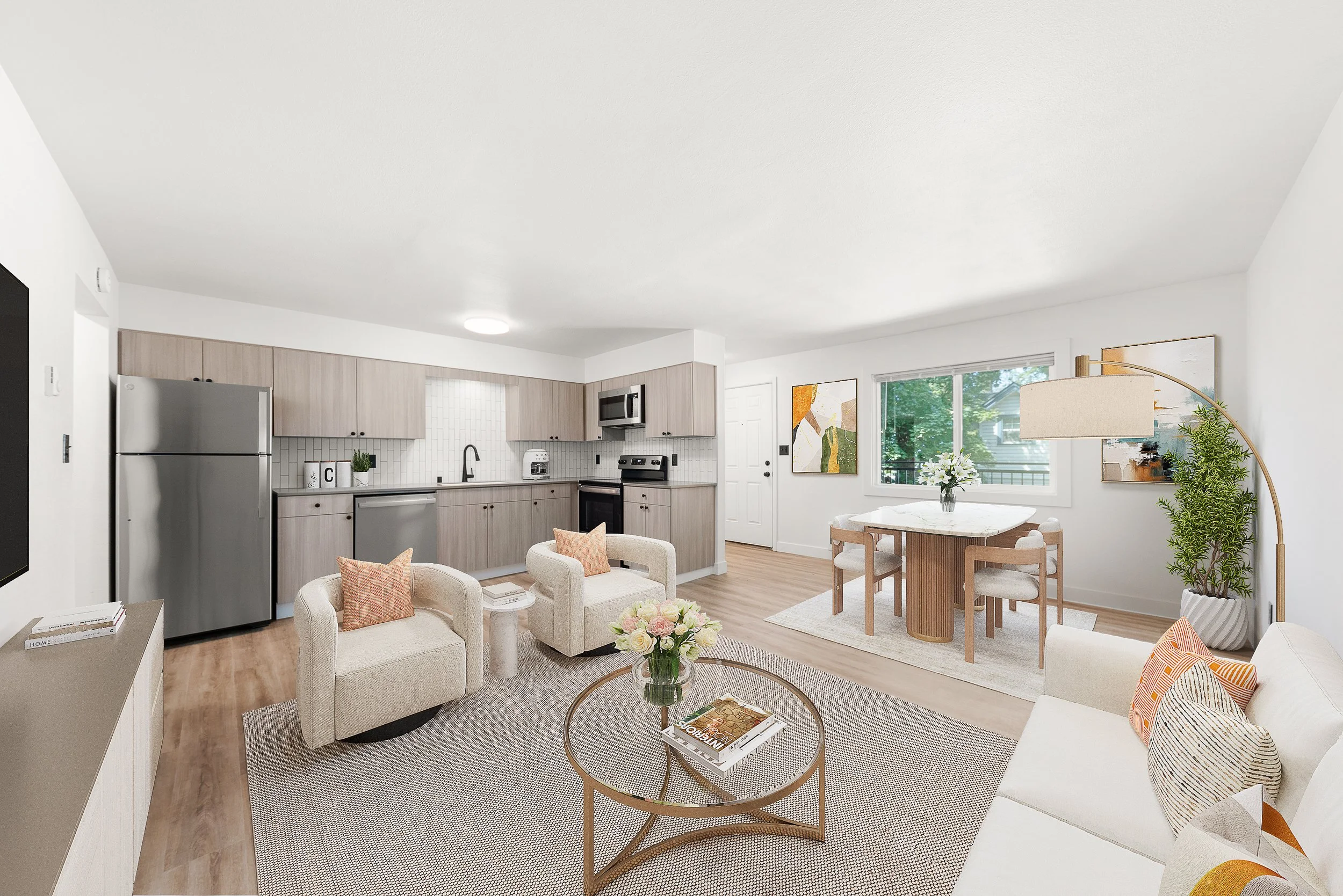Includes one virtually furnished image of the living room and one of the primary bedroom. It helps renters visualize how the space could look when fully furnished and decorated, adding warmth and sense of comfort.